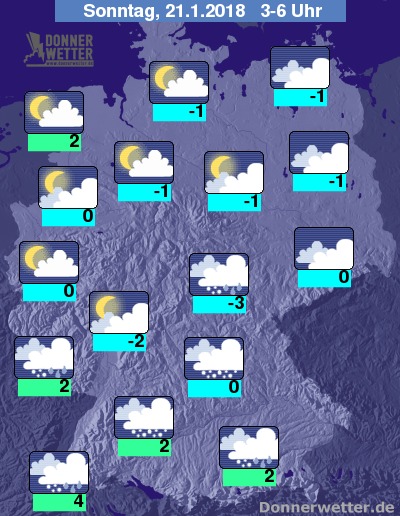 Am Sonntag kann sich im Osten und Nordosten oft die Sonne zeigen, hier bleibt es trocken. Im Süden und Südwesten ziehen dichte Wolken mit Regen, Schneeregen oder Schnee durch, sonst bleibt es zwar meist stark bewölkt, jedoch auch weitgehend trocken. Die Temperatur erreicht 0 Grad an der Müritz und bis 6 Grad im Breisgau.