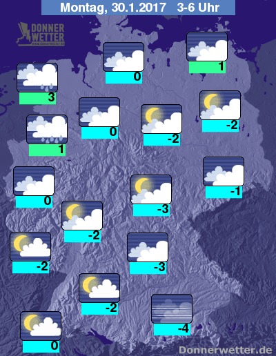 In der Nacht zum Montag ziehen dichte Wolken mit Regen, teils auch mit Schneeregen in den Nordwesten und Westen Deutschlands, stellenweise ist hier mit Glätte zu rechnen! Ebenfalls oft stark bewölkt ist es vom Norden, über den Nordosten bis in den Osten des Landes, hier bleibt es jedoch weitgehend trocken. Freundlicher und meist locker oder aufgelockert bewölkt ist es vom Süden bis in die Mitte Deutschlands, hier bleibt es trocken. Die Temperatur sinkt auf 3 Grad an der Nordsee und bis -4 Grad in Augsburg.