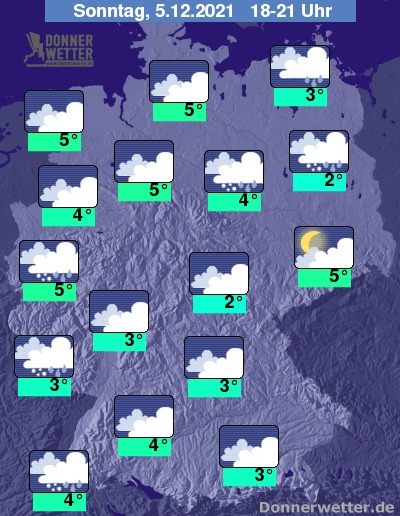 Am Sonntagabend zeigt sich der Himmel überwiegend stark bewölkt oder es ist bedeckt, dabei muss im Nordosten sowie im Westen und Südwesten weiterhin mit Regen-, Schneeregen- oder Schneeschauern gerechnet werden. In den übrigen Landesteilen bleibt es meist trocken.