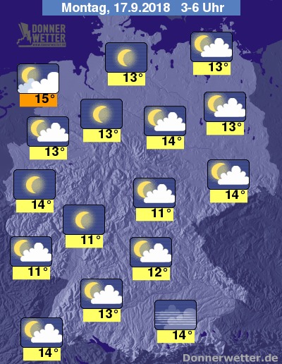 In der folgenden Nacht können im Nordseeumfeld hier und da dichte Wolken durchziehen, dabei besteht ein leichtes Schauerrisiko, sonst ist es aber verbreitet nur locker bewölkt und vielerorts auch sternenklar, dazu bleibt es trocken. Die Temperatur sinkt auf 15 Grad in Bremerhaven und bis 11 Grad im Thüringer Becken.