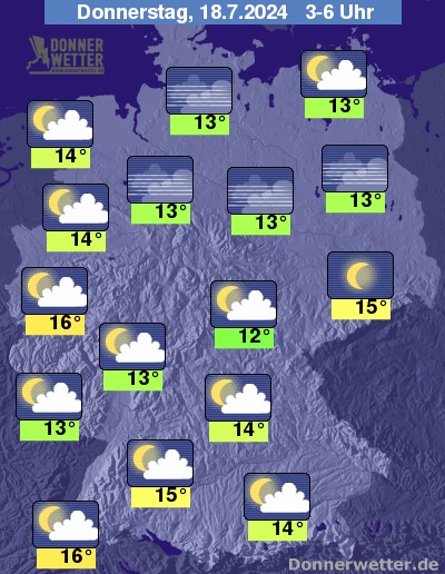 In der Nacht zum Donnerstag ist der Himmel verbreitet nur leicht bewölkt, vor allem im Norden und Osten auch überwiegend sternenklar. Es bleibt trocken bei Tiefstwerten von 16 Grad im Breisgau und bis 12 Grad im Vogtland.