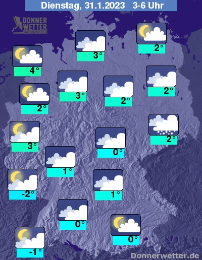 In der Nacht zum Dienstag ist es in den westlichen und nördlichen Landesteilen oft locker bis aufgelockert bewölkt und trocken. Im übrigen Land bleiben die Wolken meist dicht und über Bayern, vor allem aber über Sachsen fällt häufig Schnee oder Schneeregen. Im übrigen Bundesgebiet bleibt es weitgehend trocken. Die Temperatur sinkt auf 4 Grad an der Nordsee und bis -2 Grad am Pfälzer Wald. An den Küsten und auf den Bergen der Norddeutschen Mittelgebirge weht ein oft stürmischer Wind.