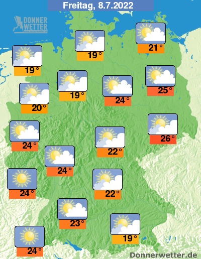 Am Freitag ist es oft heiter, gebietsweise allerdings auch aufgelockert bis stark bewölkt. Im Norden des Landes bilden sich vereinzelte Schauer, sonst bleibt es aber weitgehend trocken. Die Temperatur steigt auf 19 Grad in Hamburg und bis 26 Grad in Dresden.