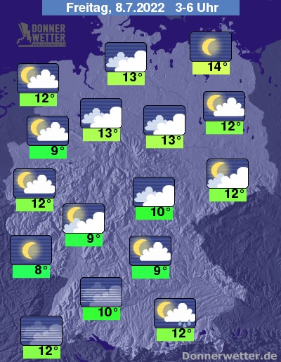 In der kommenden Nacht bilden sich am Alpenrand bei dichter Bewölkung noch weitere Schauer. Im übrigen Land ist es vor allem von der Mitte des Landes bis in den Norden oft stark bewölkt, sonst verbreitet locker bewölkt bis sternenklar. Es bleibt dazu trocken bei Tiefstwerten von 14 Grad in Rostock und 8 Grad im Saargau.