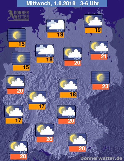In der folgenden Nacht können sich über Süddeutschland und gebietsweise auch über dem Norden Schauer und Gewitter bilden. Im übrigen Bundesgebiet ist der Himmel oft locker bis wechselnd bewölkt, teils sternenklar und es bleibt weitgehend trocken. Die Temperatur sinkt auf 23 Grad in Dresden und bis 15 Grad an der Ems.