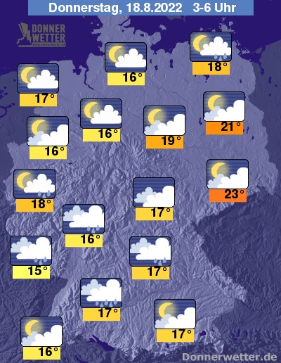 In der folgenden Nacht ziehen verbreitet dichte Wolken durch und es können sich wiederholt Schauer und mögliche Gewitter bilden. Im Nordwesten ist es jedoch oft nur locker bewölkt und hier bleibt es auch weitgehend trocken. Die Temperatur sinkt auf tropische 23 Grad in Dresden und bis 16 Grad in Münster.