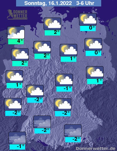 Am Sonntag ist es am Alpenrand oft heiter bis sonnig, teils ziehen hier auch einige Wolken durch, dabei bleibt es trocken. Im übrigen Bundesgebiet ist es teils locker bewölkt, zumeist ist es jedoch stark bewölkt oder trüb, dabei fallen allerdings nur selten ein paar Flocken oder Tropfen. Die Temperatur steigt auf 3 Grad in Erfurt und bis 7 Grad in Cuxhaven.