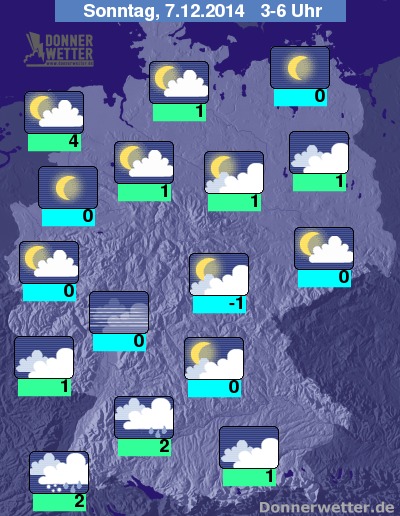 In der bevorstehenden Nacht fällt am Alpenrand zeitweise weiterer Schnee oder Schneeregen, dabei kann es weiterhin gefährlich glatt sein, nördlich davon ist es überwiegend trüb oder bedeckt, dabei bleibt es jedoch auch weitgehend trocken. Im Norden und Westen der Republik zeigt sich der Himmel oft aufgelockert bewölkt oder sternenklar, dazu bleibt es trocken. Stellenweise bildet sich jedoch Nebel oder Hochnebel. Die Temperatur sinkt auf 4 Grad in Emden und bis örtlich auf -2 Grad im Vogtland.