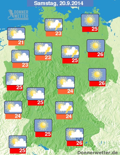 Der Samstag startet noch überwiegend freundlich und trocken, regional sind aber schon Schauer und Gewitter unterwegs, diese werden mit zunehmender Tageslänge, besonders vom Nachmittag bis Abend, häufiger. Regional kann es aber auch trocken bleiben. Weitgehend trocken und meist auch sonnig bleibt es indes noch im Nordosten des Landes. Die Temperatur steigt auf 21 Grad an der Nordsee und bis 26 Grad in Berlin.