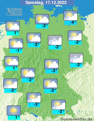 Am Samstag ist es häufig heiter bis sonnig, stellenweise hält sich allerdings Nebel oder Hochnebel, dabei bleibt es trocken. Die Temperatur erreicht -4 Grad in Stralsund und bis 1 Grad in Freiburg.