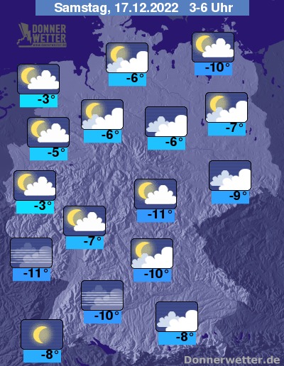 In der kommenden Nacht fällt an den Alpen gebietsweise Schnee. Dicht bewölkt ist es auch verbreitet im Osten und Norden Deutschlands, dabei bleibt es meist trocken. Im übrigen Bundesgebiet ist es häufig nur locker bewölkt oder sogar sternenklar, dazu bleibt es trocken. Stellenweise bildet sich Nebel oder Hochnebel. Die Temperatur sinkt auf -3 Grad an der Nordsee und bis -11 Grad im Saargau.