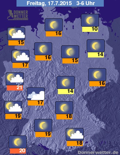 In der kommenden Nacht ziehen in den westlichen Landesteilen zum Teil dichte Wolken auf und im Westen selbst können sich auch Schauer und Gewitter entwickeln, sonst bleibt es überwiegend trocken. In den übrigen Landesteilen zeigt sich der Himmel zumeist sternenklar oder nur locker bewölkt und es bleibt trocken. Die Temperatur sinkt auf 21 Grad in Aachen und bis 10 Grad an der Müritz.