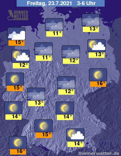 In der bevorstehenden Nacht ziehen über den Norden gebietsweise dichte Wolken hinweg, sonst ist es aber überwiegend sternenklar oder nur gering bewölkt. Es bleibt bundesweit trocken bei Tiefstwerten von 16 Grad in Dresden und bis 11 Grad in Hannover.