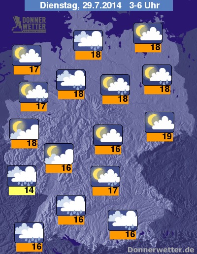 Am morgigen Dienstag herrscht wiederum verbreitet wechselhaftes Sommerwetter mit gebietsweise noch häufigem Sonnenschein am Vormittag und besonders am Nachmittag zum Teil schweren Gewittern mit Unwetterpotential. Überwiegend trocken und auch sehr freundlich bleibt es voraussichtlich im gesamten Küstenumfeld. Die Tageshöchstwerte erreichen nur kühle 19 Grad am Hunsrück und schweißtreibende 33 Grad in der Lausitz.