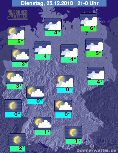 Bis Mitternacht klart es im Süden und Südwesten zum Teil ganz auf, nach Nordosten hin bleiben die Wolken dicht und vereinzelt kann es etwas tröpfeln oder nieseln.