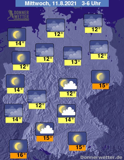 In der Nacht zum Mittwoch ist der Himmel über dem Land größtenteils sternenklar, hier und da sind auch lockere Wolkenfelder möglich, dazu bleibt es trocken. Die Temperatur sinkt auf 16 Grad in Freiburg und bis 12 Grad in Hamburg.