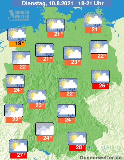 Heute Abend zeigen sich im Land verbreitet heitere Abschnitte, jedoch können auch hier und da dichte Wolken durchziehen, dabei sind aber nur vereinzelt Schauer und noch deutlich seltener Gewitter möglich. Die Temperatur liegt bei 19 Grad in Cuxhaven und bis 28 Grad in München.
