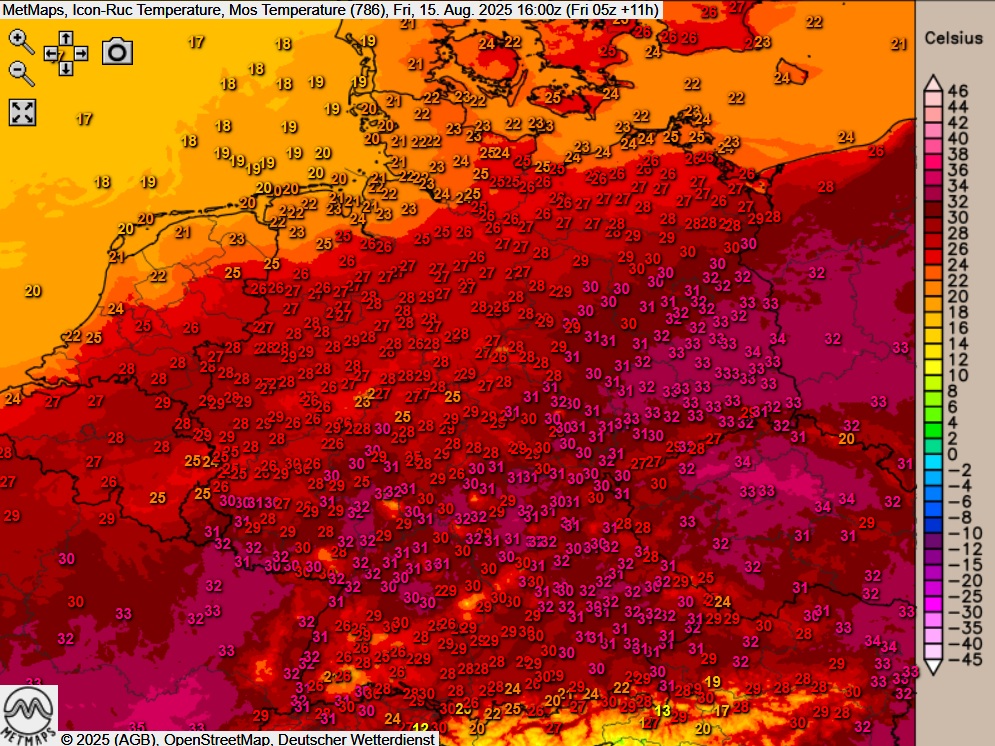 Die Temperaturkarte nach ICON-RUC für 16:00 Uhr: