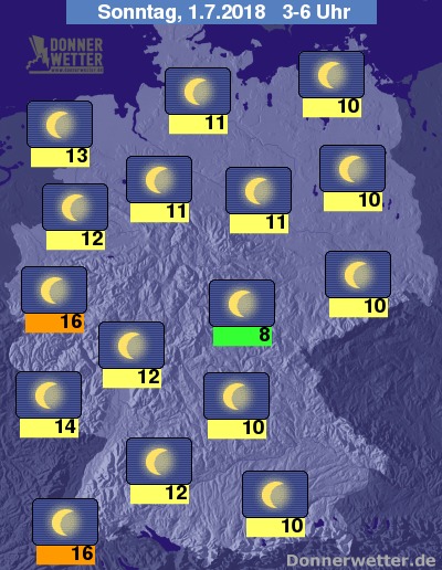 In der Nacht ist der Himmel meist sternenklar, die Temperaturen sinken dabei auf Tiefstwerte um 16 Grad C im Rheinland und um 8 Grad C im Thüringer Bergland.