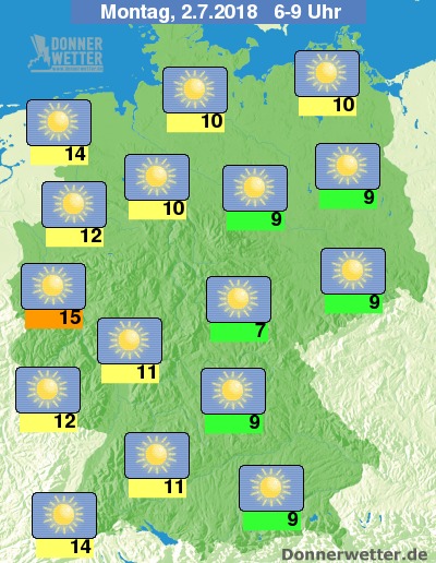 Der Weg zur Arbeit wird am Montag von Beginn an mit viel Sonnenschein versüßt. Die Temperaturen liegen anfangs noch bei eher kühlen 7 bis 9 Grad C in der Südosthälfte und 10 bis 15 Grad C im Nordwesten.