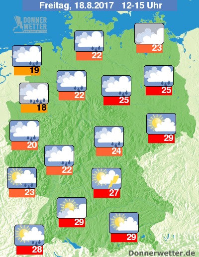 Die Höchstwerte liegen dabei zunächst zwischen 19 Grad an der Nordsee und 30 Grad am Alpenrand, jedoch kühlt es sich im Nachgang der Gewitter rasch ab.