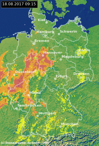 Ein Schauerband überquert Deutschland bereits gegen Mittag und sorgt zwischen Schweiz und Polen immer wieder für etwas Regen. Weitgehend trocken bleibt es über Mittag nur im Südosten des Landes. Dazu gibt es dort noch verbreitet strahlenden Sonnenschein.