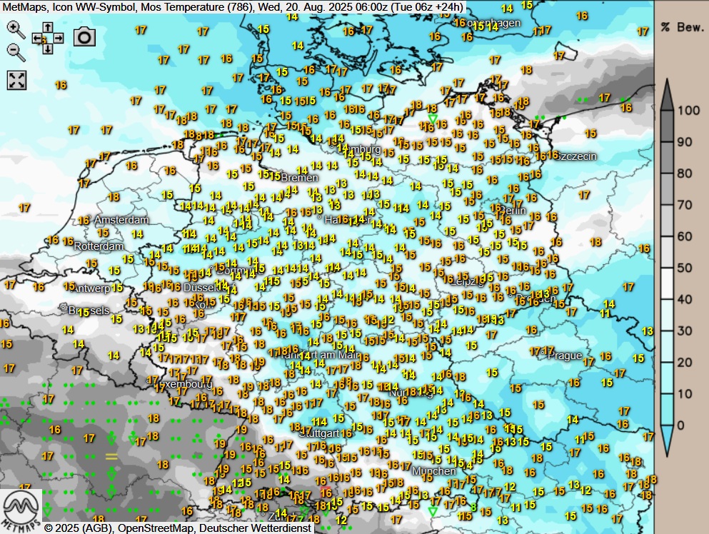 Die Karten zeigen die akkumulierten 24-Stunden-Niederschläge am Mittwoch sowie die Temperatur- und Bewölkungskarte für Mittwochfrüh (06:00 Uhr):