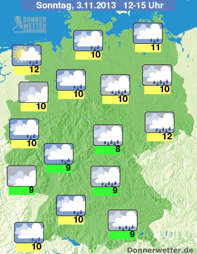 Am Sonntag können die Wolken häufiger aufreißen, allerdings regnet es auch immer wieder. Die Temperaturen liegen noch niedriger als am Samstag und erreichen meist nur noch 10 Grad. Vor allem an den Küsten und auf den Gipfeln der Mittelgebirge stürmt es, teilweise mit schweren Sturmböen, eventuell sind auch orkanartige Böen möglich.