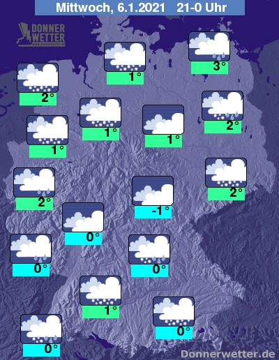 Die Temperaturen sinken bis Mitternacht auf Werte um 3 bis 1 Grad im Norddeutschen Tiefland und um 1 bis -1 Grad im Süden.