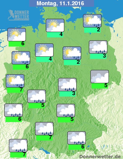 Am Montag lockert die Bewölkung im Norden des Landes häufig auf und hier bleibt es auch größtenteils trocken. Im übrigen Bundesgebiet bleibt der Himmel dagegen überwiegend stark bewölkt oder bedeckt und es fällt immer wieder Regen, im Osten auch teils Schneeregen. Die Temperatur steigt auf 2 Grad in Neubrandenburg und bis etwa 7 Grad am Mittelrhein. Besonders im Süden weht ein oft starker und teils stürmischer Wind.