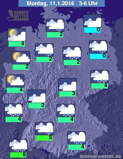 In der folgenden Nacht ziehen vom Süden Deutschlands, über die Landesmitte bis in den Osten weitgehend dichte Wolken durch und es fällt auch immer wieder Regen, der teils auch ergiebig sein kann. Hier und da mischt sich Schneeregen oder Schnee in den Niederschlag, dabei ist stellenweise mit Glätte zu rechnen! Die Temperatur sinkt auf 6 Grad in Freiburg und bis 0 Grad in Vorpommern.