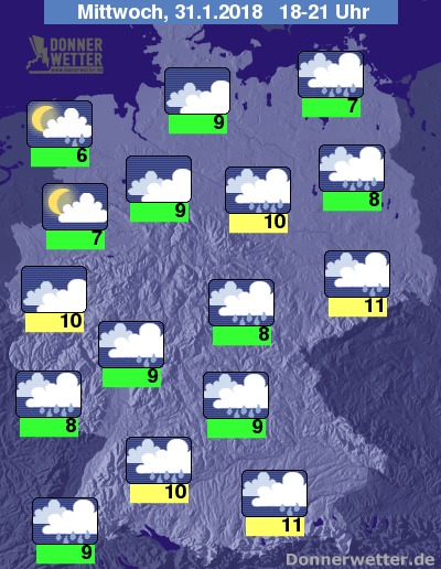 Heute Abend lockert die Bewölkung im Nordwesten des Landes oft auf, sonst bleibt es aber bei meist dichten Wolken, dabei fällt zeitweise, teils kräftiger und langanhaltender Regen. Die Temperatur liegt bei 6 Grad an der Nordsee und etwa 11 Grad in Dresden. An der See weht teils stürmischer Wind.