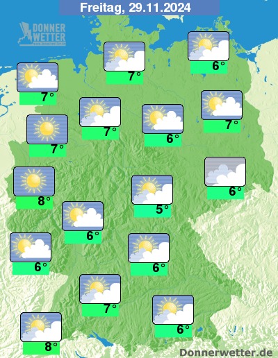 Am Freitag zeigt sich der Himmel zunächst verbreitet nebelig-trüb oder es ist hochnebelartig bedeckt, dabei kann im Südosten anfangs noch etwas Regen fallen, im Bergland Schnee. In den Nachmittagsstunden heitert es dann verbreitet auf, vor allem im Westen und Südwesten kann sich auch längere Zeit die Sonne zeigen. Dabei bleibt es niederschlagsfrei.