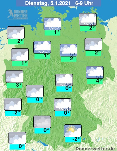 Der Dienstag startet bundesweit mit einer meist geschlossenen Wolkendecke, an den Alpen ist es regional auch aufgelockert bewölkt. Schauer, die oberhalb von 200 bis 400 Metern als Schnee fallen, konzentrieren sich in den Frühstunden vor allem auf den Norden und Osten Deutschlands.