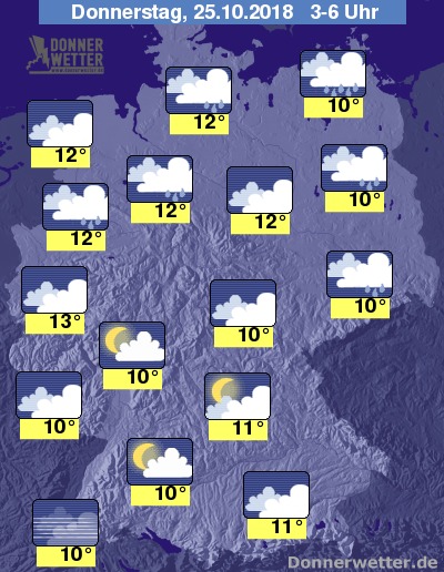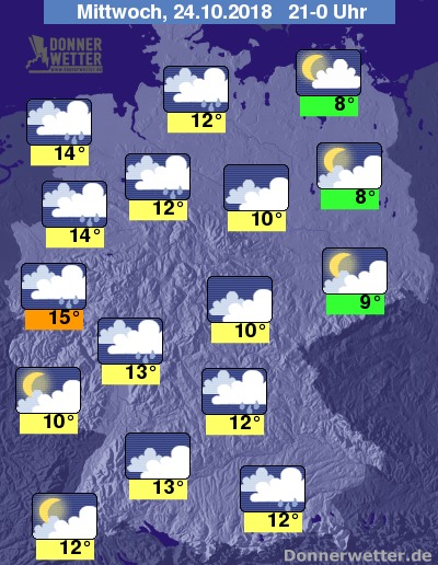Am frühen Abend dominieren meistens die Wolken, lediglich im Nordosten kann man noch einige erhellende Strahlen der untergehenden Abendsonne genießen. Vor allem im Süden und Staulagen der Mittelgebirge fällt etwas Regen oder Sprühregen. Die Temperaturen liegen meist so zwischen 10 und 14 Grad, im Westen, sowie im Markgräflerland bleibt es etwas milder.