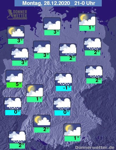 In den Abendstunden verdichten sich die Wolken über der Nordhälfte Deutschlands zunehmend; Auflockerungen beschränken sich dann vor allem auf das Küstenumfeld. In der Südhälfte bleibt der Himmel weitgehende bedeckt, entlang der Donau kann es zeitweise auch mal auflockern. Mit Niederschlägen, die in höheren Lagen auch als Schnee fallen können, muss am Montagabend vor allem im Südwesten, Südosten sowie in Brandenburg gerechnet werden.