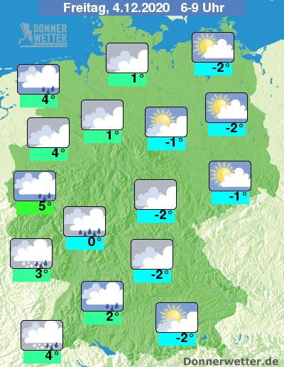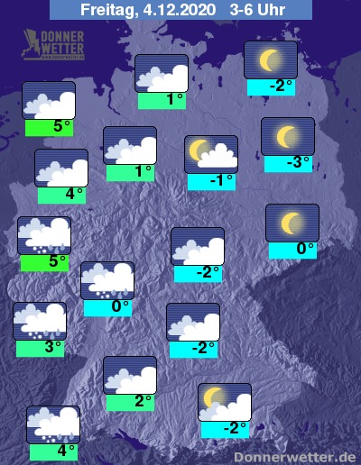 Während der zweiten Nachthälfte fällt vor allem westlich des Rheins zeitweise Regen oder Schneeregen, in höheren Lagen auch Schnee mit Glättegefahr. Sonst nimmt die Bewölkung allgemein zu, es bleibt jedoch trocken. Von Sachsen, über Brandenburg, bis zur Ostsee leuchten zum Teil noch Mond und Sterne.