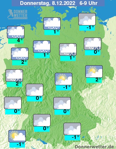 Der Donnerstag startet verbreitet stark bewölkt oder der Himmel ist bedeckt. Im Norden und Nordwesten muss dabei immer wieder mit Regen oder Schneeregen, im Bergland Schnee gerechnet werden. Im Süden bleibt es bei wechselnder bis starker Bewölkung meist trocken.