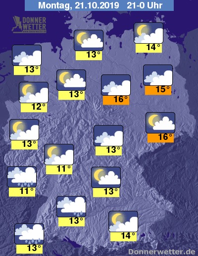 In den Abendstunden ist der Himmel zunächst bedeckt oder es ist aufgelockert bewölkt, in den späteren Abendstunden lockern die Wolken regional weiter auf. Es bleibt häufig trocken, nur im Südwesten muss in den nächsten Stunden mit Schauern gerechnet werden, zwischen Mosel und Oberrhein kann es zeitweise auch kräftiger und anhaltender regnen.