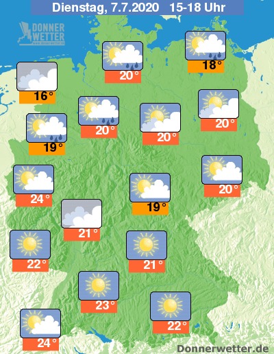 Die Temperaturen bewegen sich im Norden und in den Mittelgebirgen meist zwischen verhaltenen 15 und 20 Grad, in der Südhälfte werden angenehmere 20 bis 23 Grad erwartet.