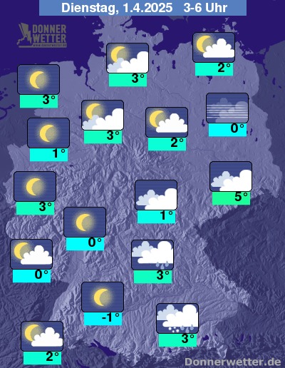 In der Nacht zum Dienstag überwiegt über dem Südosten noch starke Bewölkung, vor allem am Alpenrand und im Erzgebirge fallen noch einzelne Schauer, oberhalb von 700 m auch Schnee. Sonst ist es sternenklar oder nur gering bewölkt und es bleibt trocken.