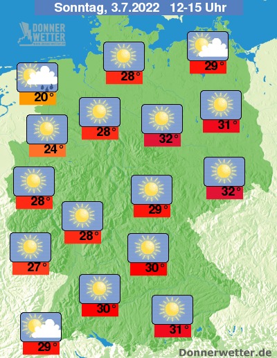 Heute Nachmittag ist es verbreitet heiter bis sonnig, gebietsweise ziehen auch ein paar Wolken durch. Im Nordwesten bilden sich vereinzelt auch Schauer oder Gewitter, während es im übrigen Land weitgehend trocken bleibt. Die Temperatur liegt bei 20 Grad an der Nordsee und etwa 32 Grad in der Lausitz.