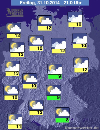 Zur "Süßes oder Saures"-Zeit am frühen Abend gibt es im Westen noch um 16 Grad, im Nordosten um 11 Grad. Zu der Zeit, wenn die älteren Schreckgespenste unterwegs sind, sieht's natürlich schon etwas frischer aus: