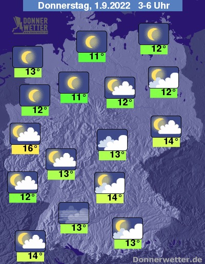 Die Temperaturen erreichen in den Frühstunden Werte um 11 Grad im Münsterland und 16 Grad in der Sächsischen Schweiz.