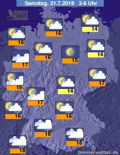 In der kommenden Nacht ziehen über die Südhälfte häufig dichte Wolken hinweg, die hier und da auch Schauer und selten auch Gewitter mit sich bringen. Weiter nach Norden hin ist es dagegen meist leicht bis aufgelockert bewölkt, dazu bleibt es trocken. Die Temperatur sinkt auf 19 Grad in Köln und bis 14 Grad im Raum Berlin.