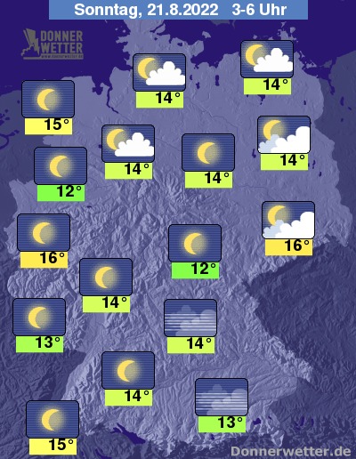 In der folgenden Nacht ist es in den östlichen Landesteilen anfangs noch teils stark bewölkt, jedoch bereits weitgehend trocken. Im übrigen Land zeigt sich der Himmel schon verbreitet sternenklar und es ziehen kaum mehr Wolken durch. Es bleibt trocken bei Tiefstwerten von 16 Grad in der Lausitz und 12 Grad am Niederrhein.