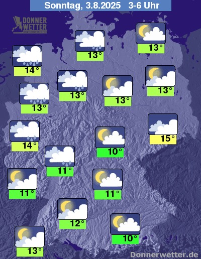 In der Nacht zum Sonntag ziehen im Nordwesten und nachfolgend im Westen dichte Wolken und neuer Regen auf. Im übrigen Bundesgebiet ist der Himmel oft locker oder aufgelockert, teils auch stark bewölkt, dazu bleibt es weitgehend trocken. Die Temperatur sinkt auf 15 Grad in Dresden und 10 Grad in Augsburg.