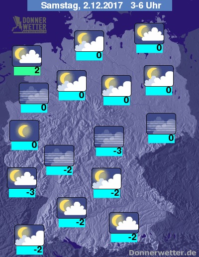 In der Nacht zum Samstag halten sich im Norden und Osten oft einige und teils dichte Wolken aus denen jedoch kaum Niederschlag fällt, im übrigen Bundesgebiet zeigt sich der Himmel hingegen verbreitet locker bewölkt oder sternenklar. Es kühlt auf Temperaturen zwischen 2 und -3 Grad ab.