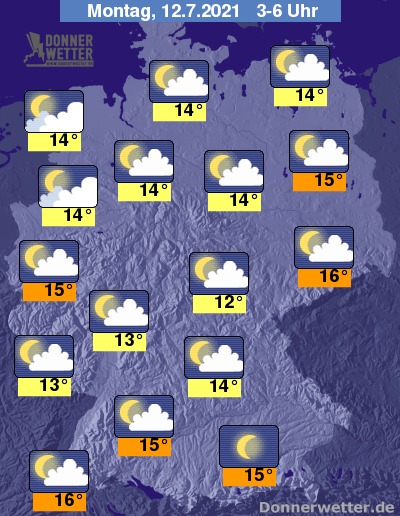 In der Nacht zum Montag zeigt sich der Himmel überwiegend locker bewölkt, oft auch sternenklar. Vor allem im Nordwesten halten sich gebietsweise auch dichtere Wolken. Es bleibt landesweit trocken bei Tiefstwerten von 16 Grad in Dresden und 12 Grad in Erfurt.