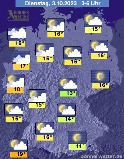 In der kommenden Nacht ist es im Nordseeumfeld oft bedeckt und hier können sich einzelne Schauer bilden. Im übrigen Land ist der Himmel zeitweise sternenklar, teils ziehen auch einige Wolken durch, dazu bleibt es trocken. Die Temperatur sinkt auf 19 Grad in Freiburg und 13 Grad in Erfurt.